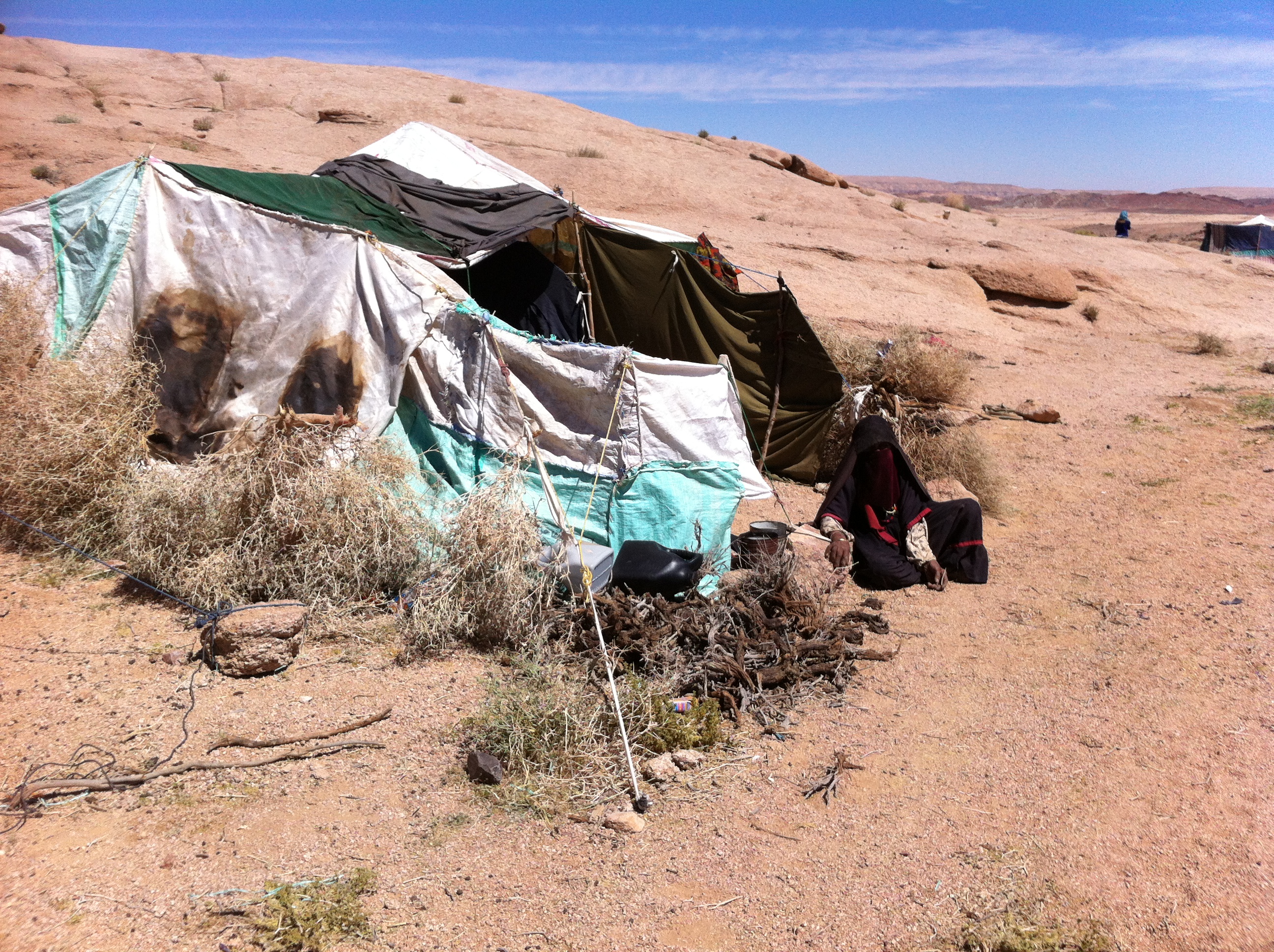 In the house or tent here is a specific place to receive male guests. In a house, this room may be elaborately decorated if the family happens to have money:  nice cushions, rugs and curtains hanging from the walls (even where there are no windows).  Usually every house, tent or settlement has a “mag’ad” – this is where visitors are received or where men congregate to socialize. In a house it is often a lean-to with a roof made of palm fronds (called a hosha)  in the yard, with mats and a mangad. At a nomads tent, it might be a free-standing arisha away from the other tents, or a separate tent. In a settlement you might find a mag’ad at the edge of the settlement in the form of a small stone square wall of rocks, or maybe even just a fireplace by itself. When male-only, non-family member guests are present, then the females retreat to “their” part of the dwelling: another room or another tent.