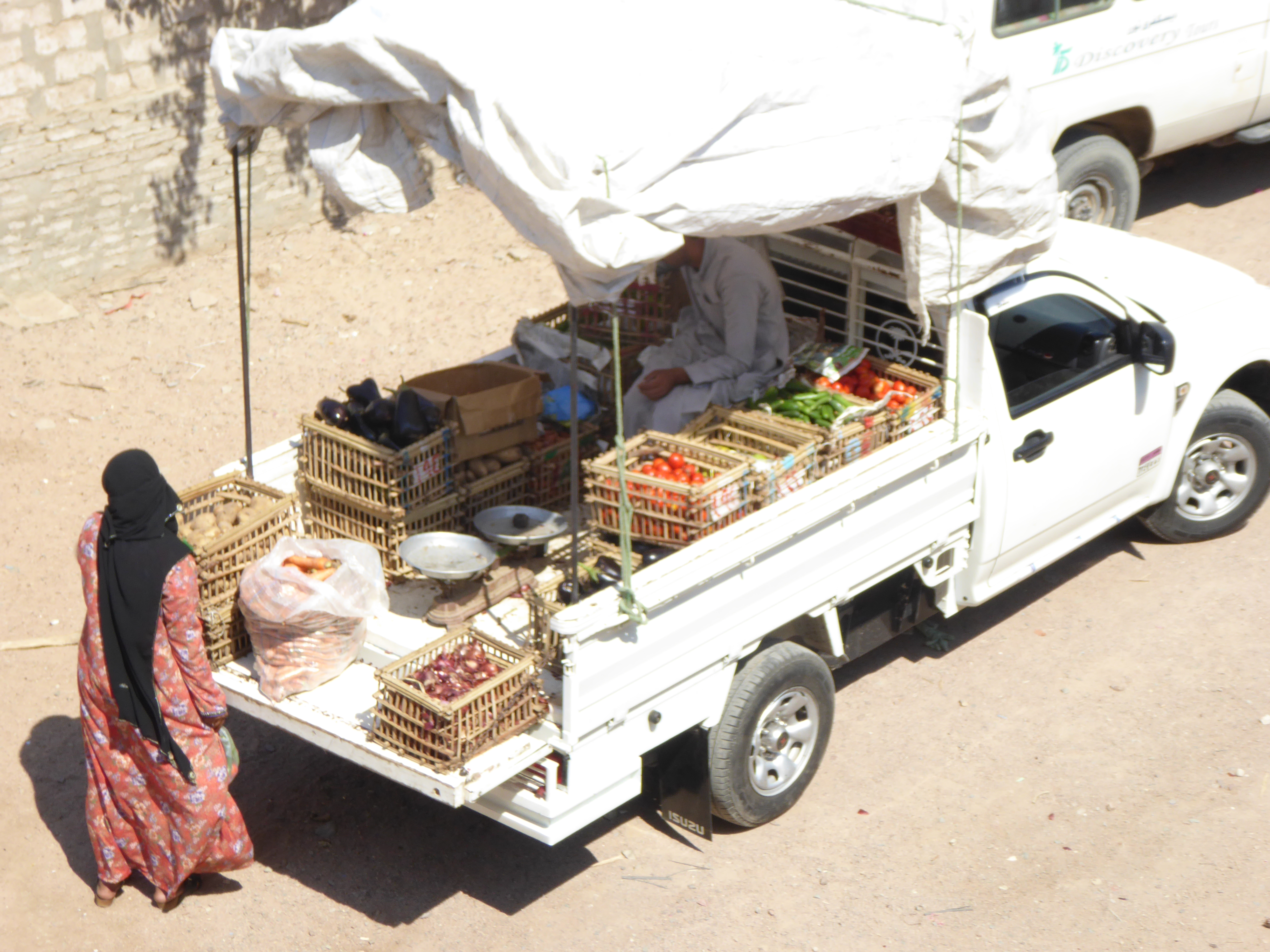 In town the men go to the shops to buy food, or the women send their children or brothers. If a woman has no male family members or children they will cover up in a black abeya and headscarf and go to the shop themeselves. There are also “mobile shops” – pick up trucks that regularly drive around the streets selling clothes, fresh fruit and vegetables, gas, and fresh spring water. The women buy from these trucks and thus don’t need much from the shops as they provide most of the necessities.