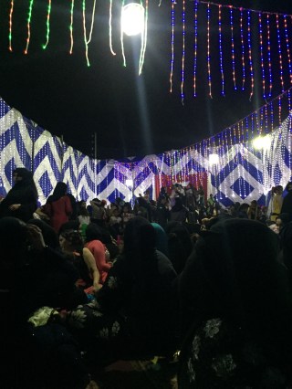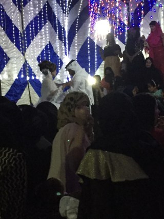 Inside the high tent walls, with no roof, just a starry night above, I could see a stage at one end with a double seater chair for the bride and groom. Women sat cross-legged on the floor in large clumps, wearing their abeyas and black scarves, under which were hidden fancy, sparkling, sequined dresses in all colours. Some had abandoned their abeya on floor and were dancing. Wow. It looked like a Bedouin night at the Oscars. I tried to spot someone I knew, but when you can only see their eyes and nose, some black hair, some hands and a sea of abeyas….it’s quite difficult to my untrained eye to differentiate everyone. They are used to recognizing each other like this though, which always amazes me!